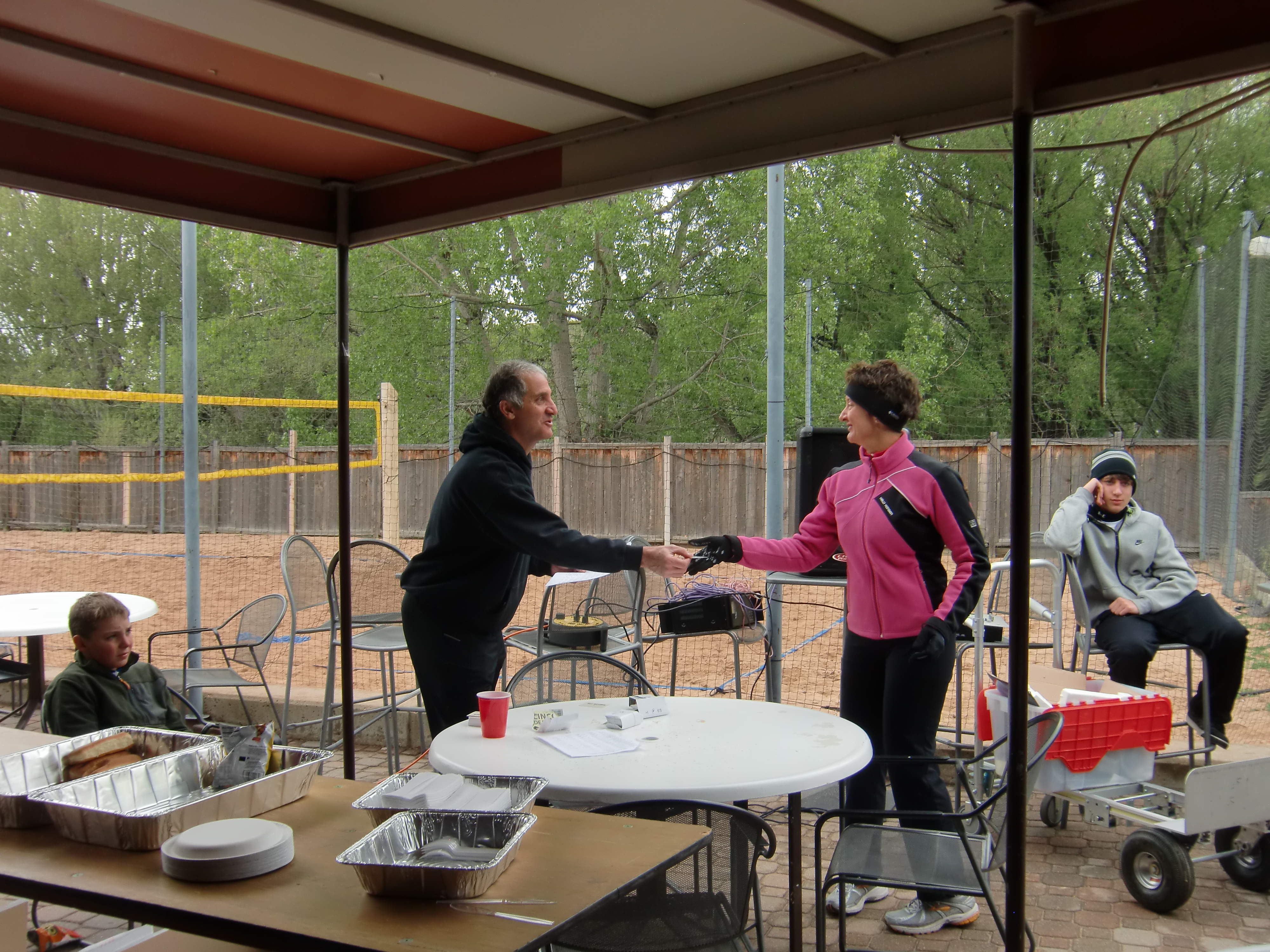 Exiting the pool the outdoor temp was 37 degrees. I pulled on my bike jacket, put on my helmet, bike gloves and ran with my bike toward the Bike Start…oops, forgot my race number and back I went to collect that key item. Once on the road I realized that while it was wet it wasn’t icy. Still being a rookie cyclist I was cautious as was necessary. I remembered the tips from Joe V at Giant cycles. I soon realized that I was passing more people than people passing me. Three laps of the circuit would complete the 12 mile bike leg. Seeing my guys and hearing them cheer me on with each completed loop with little guy yelling “Go Momma, Go!” (hence the name of my website being Triathlon Momma) was a thrill and it did make me go faster, I think. Off of the bike and running Zen into T2. After I re-racked Zen then helmet off, bike shoes off, bike gloves off, running shoes on, bike jacket off, running jacket on, running hat on.