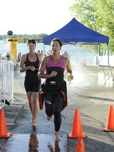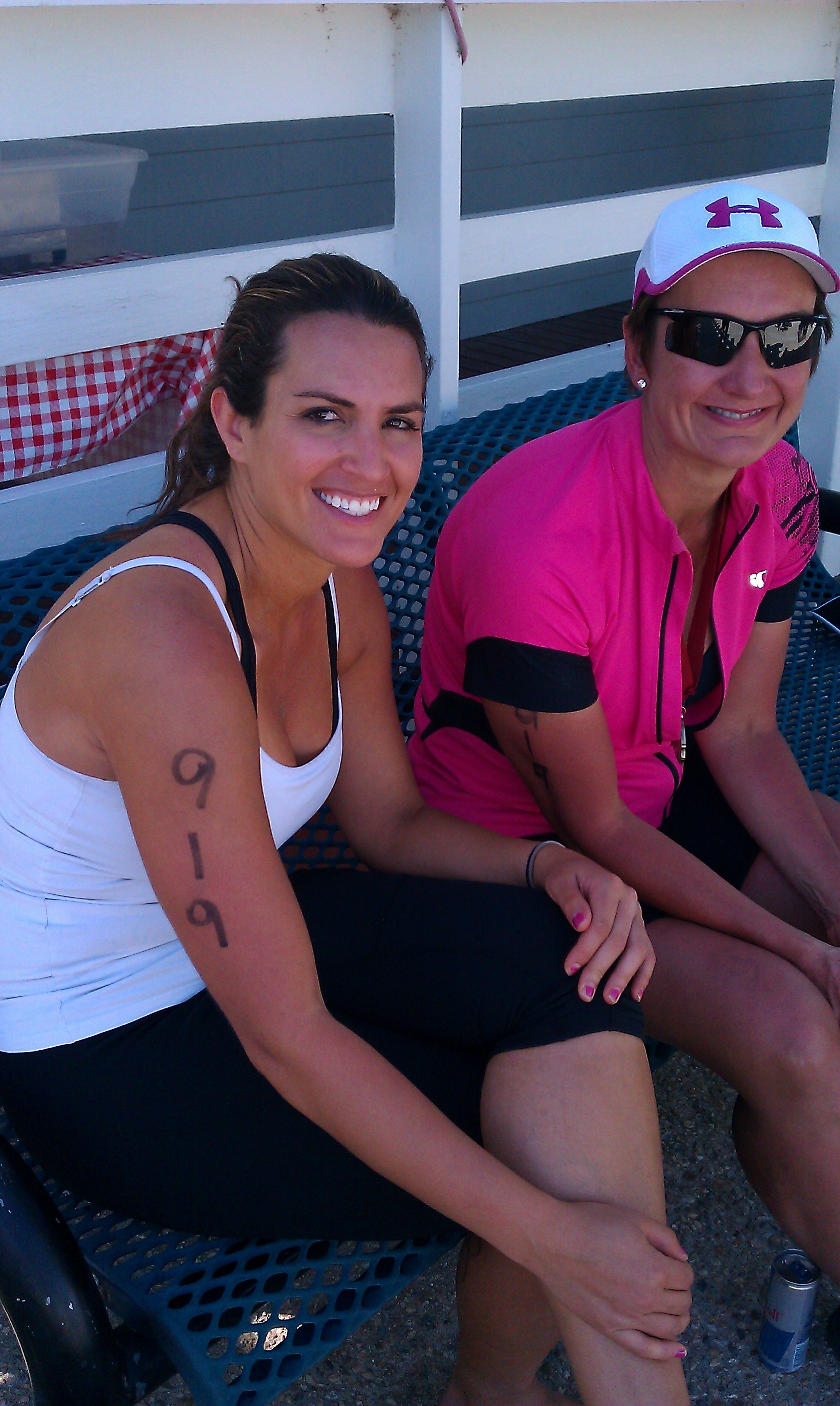 T2 went by without event and I was onto the run course which was an out and back 5K. As I ran along I could feel my heart rate hitting the anaerobic zone meaning that I had reached my limit from an endurance capacity perspective. Thoughts of walking “just a little bit” started to enter my head. Then began a private and thankfully “silent” conversation with myself. For all those early 4:45 a.m. mornings and for all those hideous, painful threshold runs that @CoachCary put on my calendar, I would NOT let myself down and I would NOT walk. As I approached the ad station which I was happy to note occurred twice given the course being out and back. These fabulous bare-chested specimens of manliness were handing out cold water and Gatorade. Very nice…I certainly wasn’t going to look like a wimpy girl and walk through THAT aid station although it would have been nice to linger and look (gawk). Did I walk? NOPE, not this time! As I was heading into the last stretch of the run, I saw my friend Heather B, up ahead. We pretty much ran the last portion of the race course together. Crossing the finish line at an all out sprint felt great and after downing a couple of bottles of water and a brief walk to recover I was no worse for wear. Also, I thankfully didn’t get called a “Penguin” on this run.